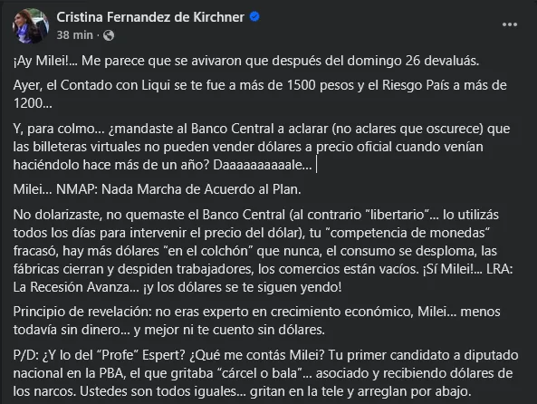 Bajo el título irónico “¡Ay Milei!”, Fernández de Kirchner señaló que el dólar financiero (Contado con Liquidación) superó los $1500 y que el Riesgo País subió por encima de los 1200 puntos. “Me parece que se avivaron que después del domingo 26 devaluás”, escribió, en referencia a una posible devaluación tras las elecciones del 26 de octubre.