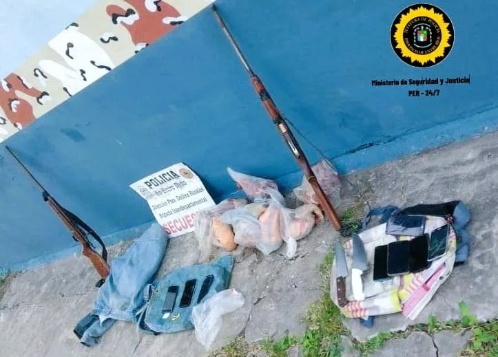 En los tres Allanamientos y Requisas Domiciliarias se encontraron y secuestraron elementos de interés para la investigación que fueron puestos a disposición de la fiscalía; en la vivienda allanada en calle 25 de Mayo de la ciudad de Bovril se incautaron cinco teléfonos celulares, tres cuchillos y una mochila con manchas de sangre. Mientras que en las dos restantes fincas registradas, una por calle San Martín y la otra por calle Pública S/Nº de la localidad de Sir Leonard, secuestraron Un Arma de fuego “hechiza” calibre 36, con un cartucho percutido del mismo calibre, con elementos para recarga y dos teléfonos celulares táctiles; y lo más destacado treinta y cinco (35) Kg de Carne vacuna con restos de pasto y manchas de tierra, proveniente de faena a campo, una campera y una maleta con manchas de sangre, un carabina calibre .22 largo con trece proyectiles del mismo calibre y otro teléfono celular.