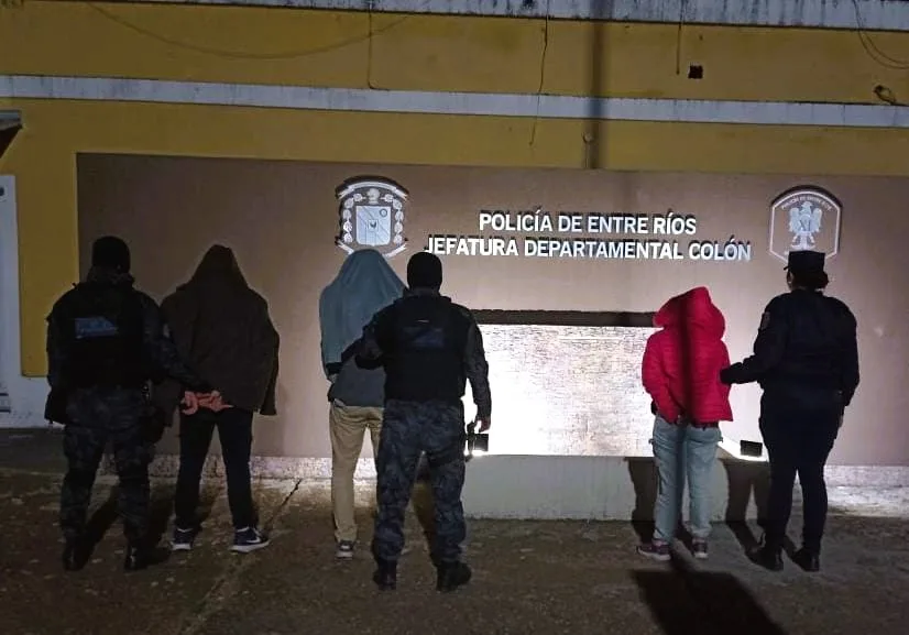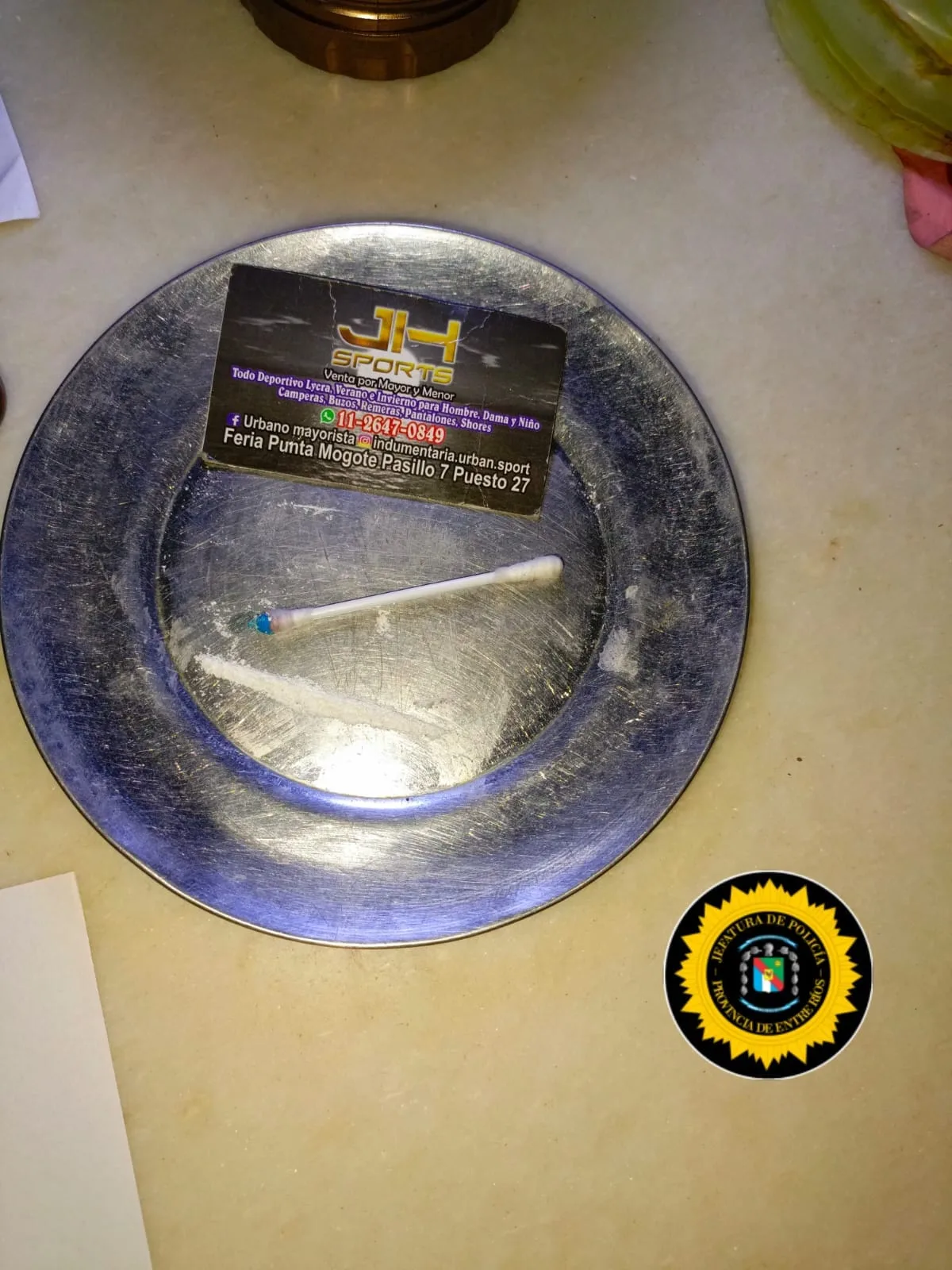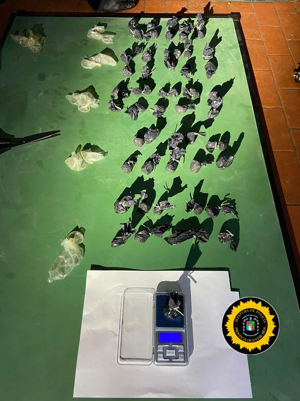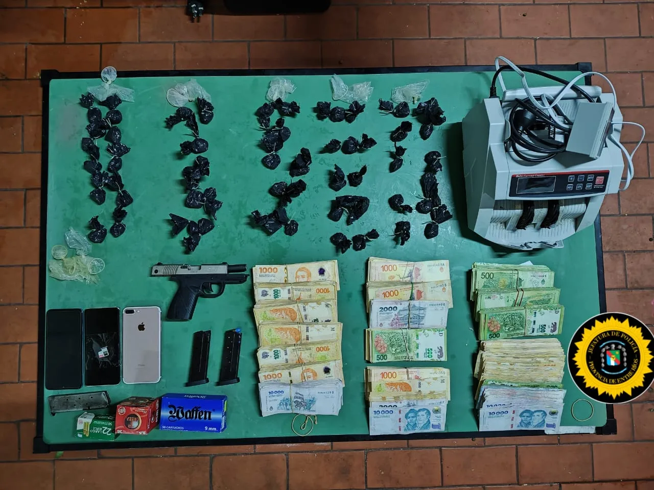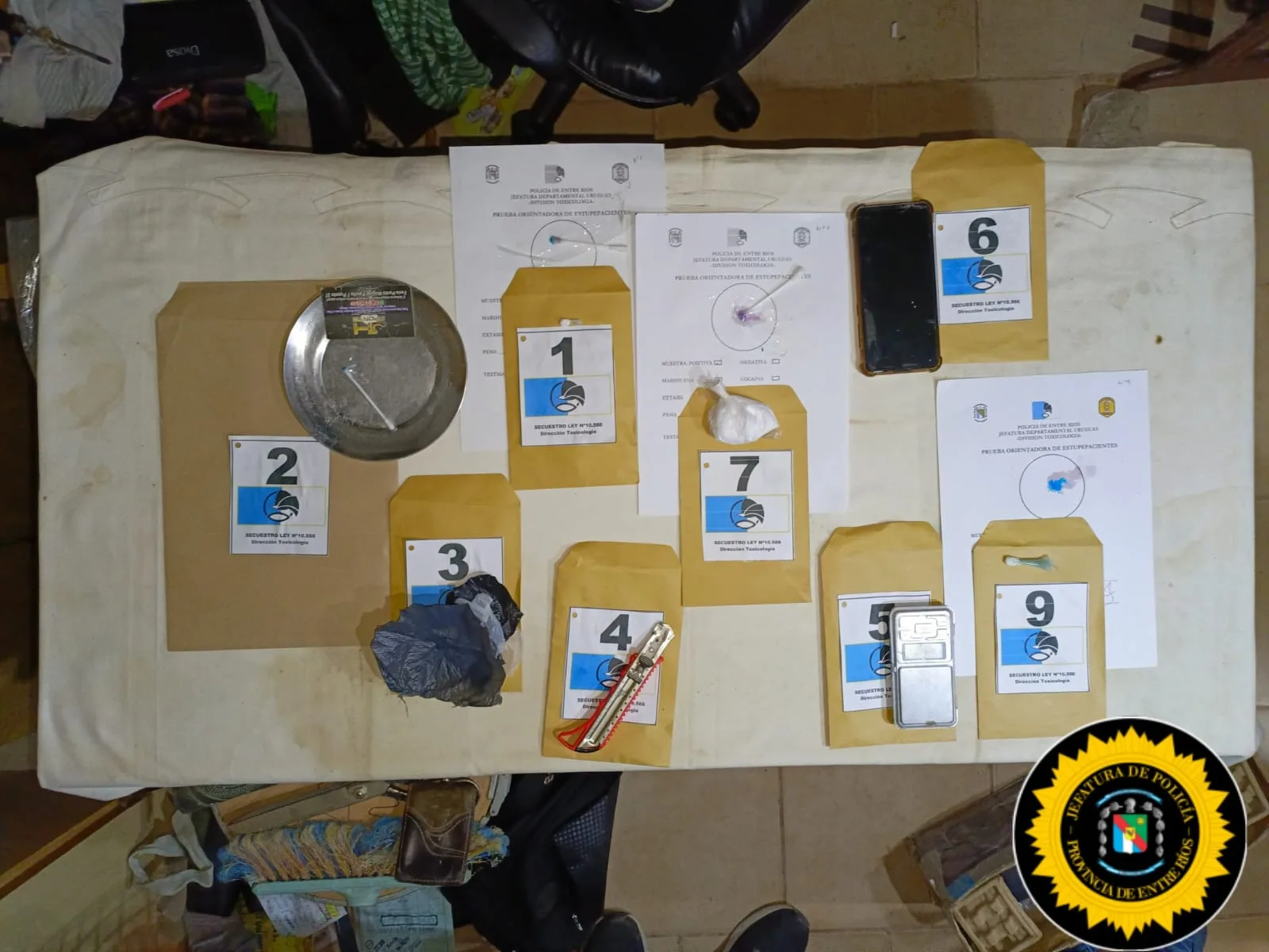 El primer procedimiento tuvo lugar en la ciudad de Colón, donde se identificó un importante punto de venta de drogas. Durante la requisa del lugar, se localizaron 50 envoltorios de nylon con cocaína, varios recortes de bolsas, casi tres millones de pesos en efectivo, una máquina contadora de billetes, un arma de fuego calibre 9mm marca Bersa con 32 cartuchos, y 42 cartuchos calibre .22. Además, se secuestraron una camioneta Toyota Hilux y un auto VW Bora. En el lugar, fueron detenidos dos hombres y una mujer, todos familiares, al finalizar la medida.