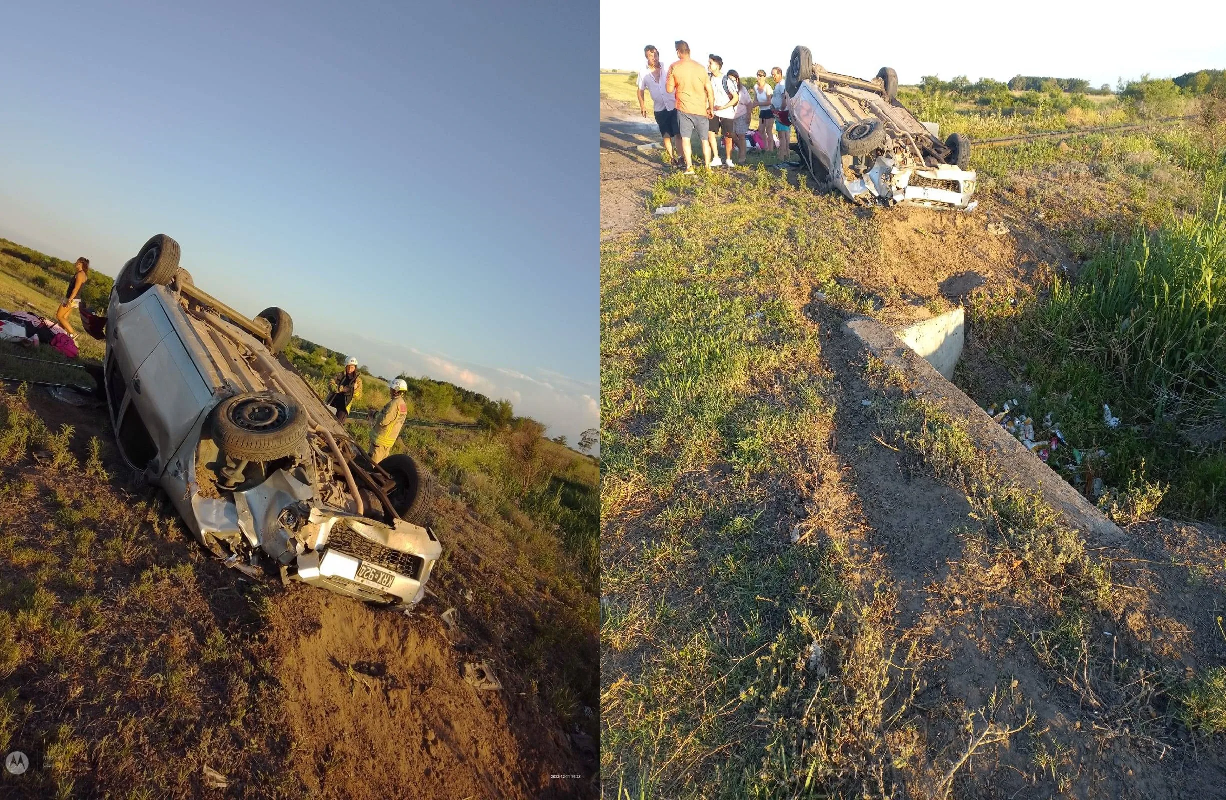 En horas de la tarde de este domingo, bomberos voluntarios de ceibas asistieron a las 19:05 hs sobre un siniestro vial en Ruta Nacional 12 km 191 mano Entre Ríos a Buenos Aires Paso a Nivel Médanos, sale móvil n°19 de rescate rápido al arribo de la dotación se encuentran con vehículo marca Renault modelo Sandero volcado sobre la banquina, tres ocupantes conductor masculino el mismo pierde el control del vehículo despista y termina volcando quedando sobre la banquina a escasos metros de la vía del ferrocarril , acompañantes masculino menor de edad domiciliados en Villa Gesell y femenina mayor de edad domiciliada en Gualeguay, venían de Goya Corrientes se dirigían a Villa Gesell Buenos Aires, ocupantes con lesiones leves asistido por personal de Salud Médanos.