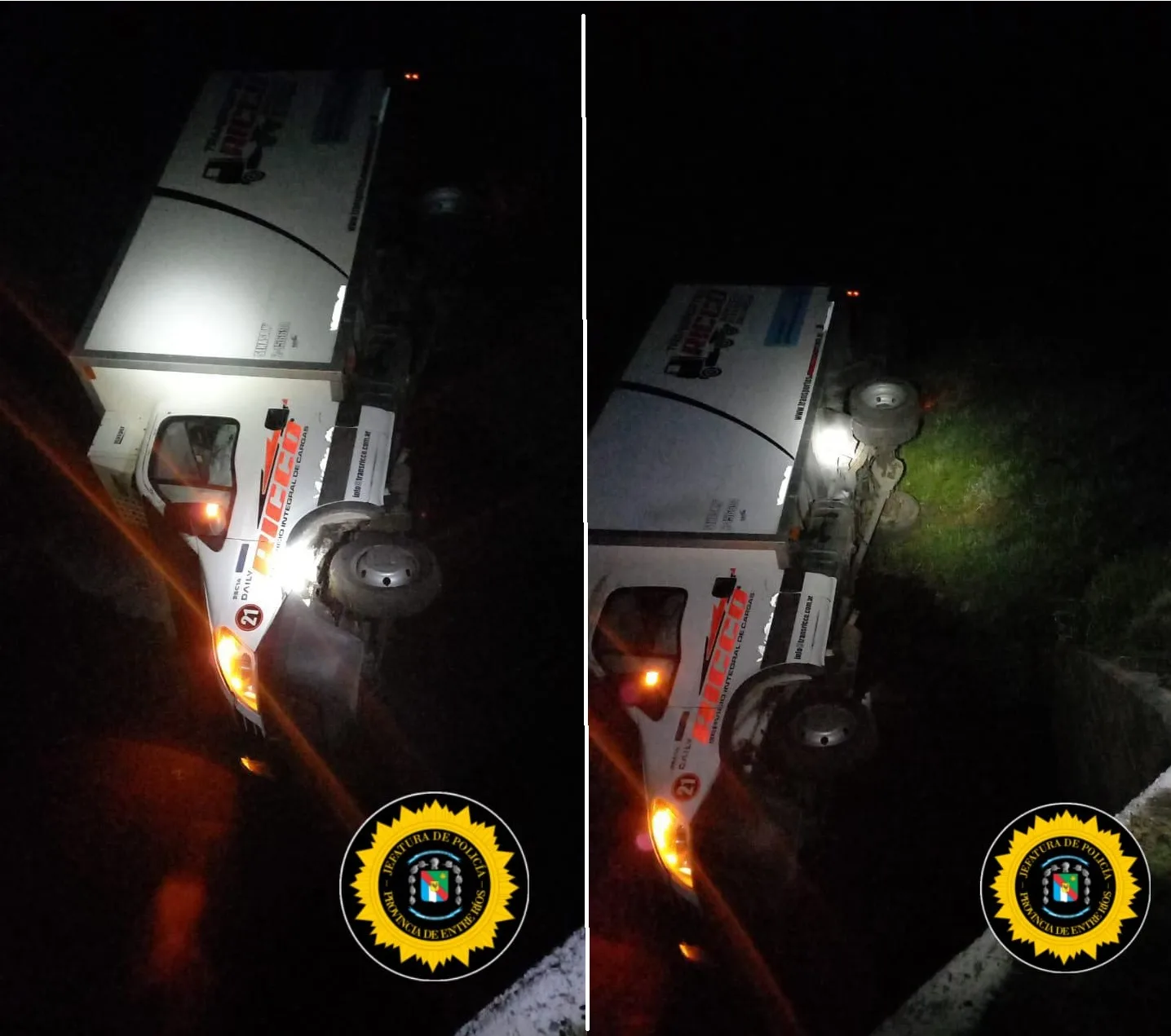 En la madrugada de hoy, a la 01:00 hs, personal de la Comisaría Mansilla fue convocado para intervenir en un accidente de tránsito en el kilómetro 299 de la Ruta Nacional 12. Un camión utilitario marca Iveco, modelo Daily, despistó y volcó mientras se dirigía desde Buenos Aires hacia Colonia Avellaneda, Paraná.