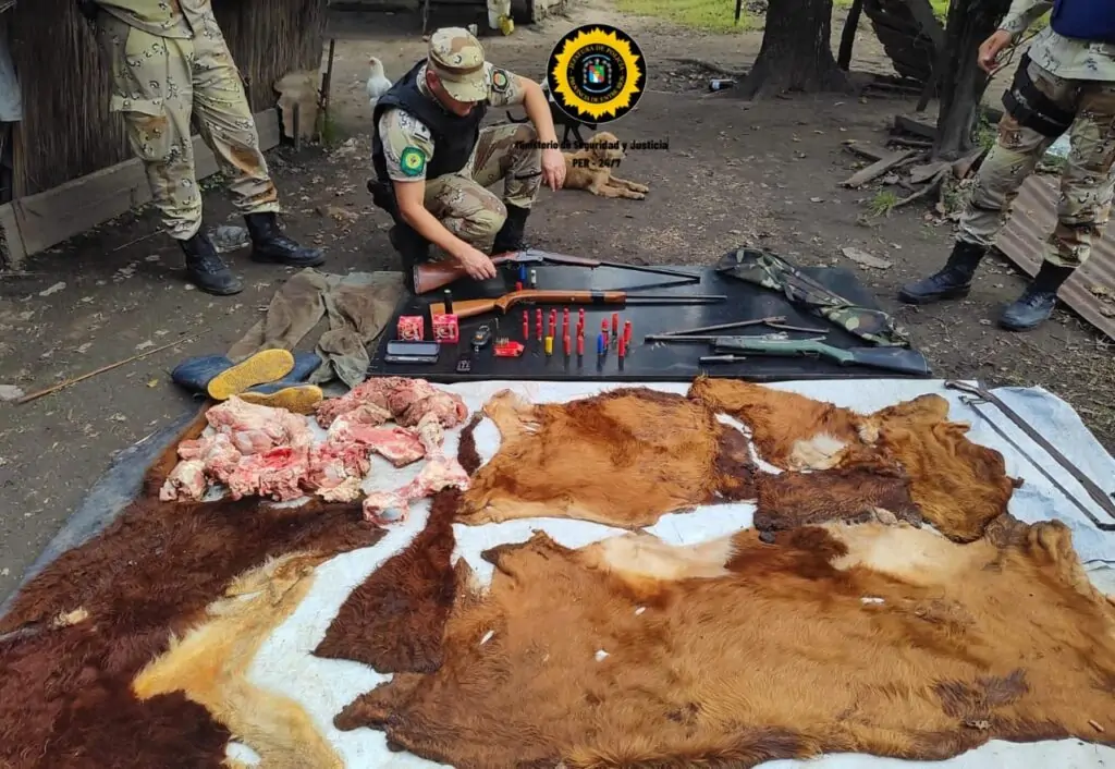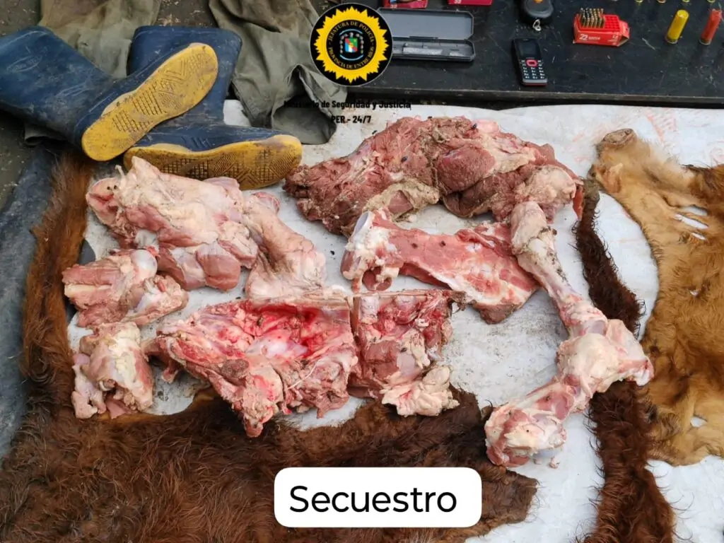 Además del arsenal ilegal, se encontraron pruebas contundentes relacionadas con el delito de abigeato que estaba siendo investigado, incluyendo prendas de vestir con sangre, cuero de terneros, una cierra carnicera, teléfonos celulares y una cantidad considerable de carne vacuna.