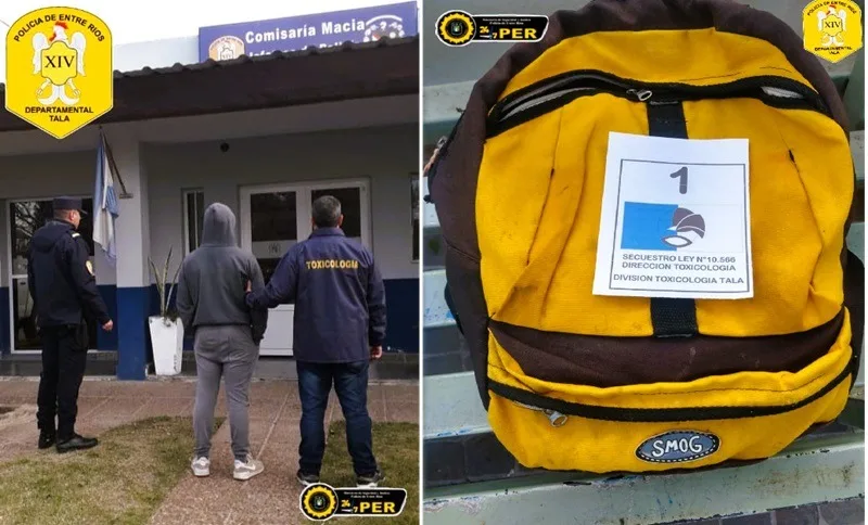 Informada la fiscalía en turno, se dispuso el secuestro de un teléfono móvil y la mochila del sospechoso, quien fue trasladado a la sede de la Comisaría de Maciá para su correcta identificación y examen médico, en el marco de una supuesta infracción a la Ley Provincial N° 10.566 de Narcomenudeo.