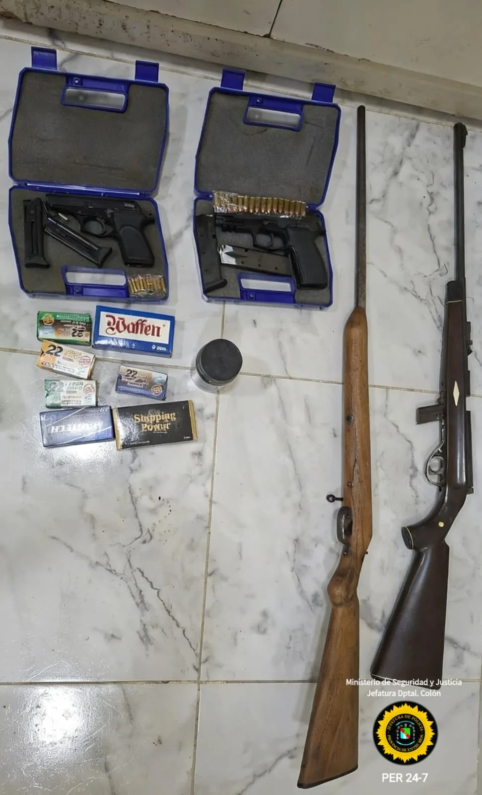 Como resultado del procedimiento, los uniformados secuestraron una pistola calibre .22 mm marca Bersa Thunder con dos cargadores, una pistola 9 mm de la misma marca con dos cargadores, una escopeta tiro a tiro marca Centauro, una carabina calibre .22 largo marca Rubí Extra, además de una importante cantidad de cartuchos de distintos calibres.