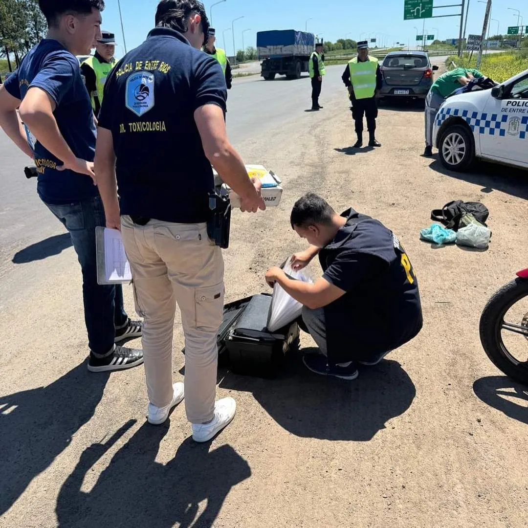 En un operativo de control vehicular realizado en el Puesto de Control Vial Gualeguaychú, ubicado en el kilómetro 100 de la Ruta 14, los oficiales identificaron a los tripulantes de un motovehículo y, tras inspeccionar sus pertenencias, detectaron estupefacientes. El resultado fue el secuestro de dos bolsas de cogollos de marihuana y la detención de dos personas.