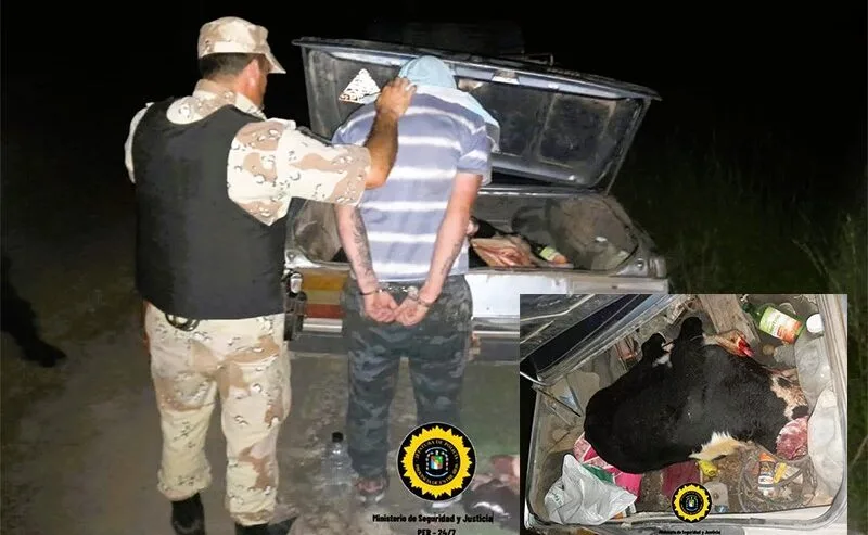 En la noche de este martes, personal policial de la Dirección Prevención Delitos Rurales, Brigada Interdepartamental (Bovril), en circunstancias en que los uniformados realizaban recorrida de prevención por un camino vecinal de Colonia Viraró, Departamento La Paz, en virtud al llamado de un productor rural que ponía en alerta por un vehículo sospechoso en la zona; es que los brigadistas interceptan en dicho camino vecinal un automóvil Marca Peugeot 505, color gris, conducido por un ciudadano de 28 años oriundo del barrio Matadero de la ciudad de Bovril; ante el control policial, los uniformados se llevan la sorpresa que está persona en el baúl del rodado llevaba un animal vacuno de categoría ternero, (degollado), sin sus cuatro extremidades y cabeza; además en una mochila tenía las vísceras (hígado, corazón, riñones y parte de intestinos); al encontrarse está persona en un evidente estado de nerviosismo y sin poder justificar la procedencia del animal, por ser de un hecho de abigeato; además de tener en su poder envoltorios con marihuana, y bolsas de nylon fraccionados con sustancia blanca, y una importante suma de dinero sin poder precisar de donde la obtuvo.