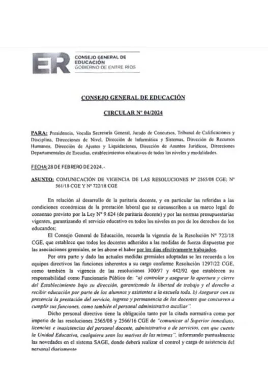 La presidente del CGE, Alicia Fregonese, confirmó que se descontarán los días de paro, y que el aumento no se liquidará hasta que haya acuerdo, e insistió en que “vamos a seguir dialogando permanentemente puesto que la idea del gobierno es llegar a un acuerdo porque consideramos que los estudiantes tienen que estar en el aula y que cada día cuenta para mejorar los aprendizajes”.