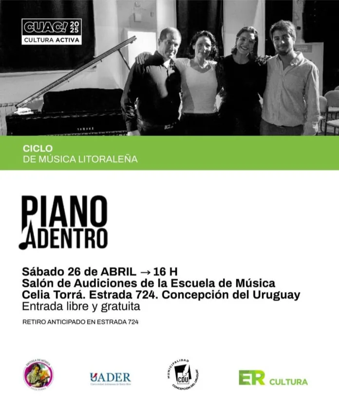 El evento forma parte del ciclo “Piano Adentro, solistas litoraleños”, un proyecto que reúne a cuatro músicos entrerrianos: Kevin Mernez (Nogoyá – Concepción del Uruguay), Aline Soto (Villa Libertador San Martín – Paraná), Lucio Salisky (Rosario del Tala) y Silvia Teijeira (Federal – Paraná), que juntos recorren la provincia con un repertorio diverso que incluye chamamé, candombes, canciones litoraleñas, tango, zambas, chacareras y otras expresiones de la música popular argentina.