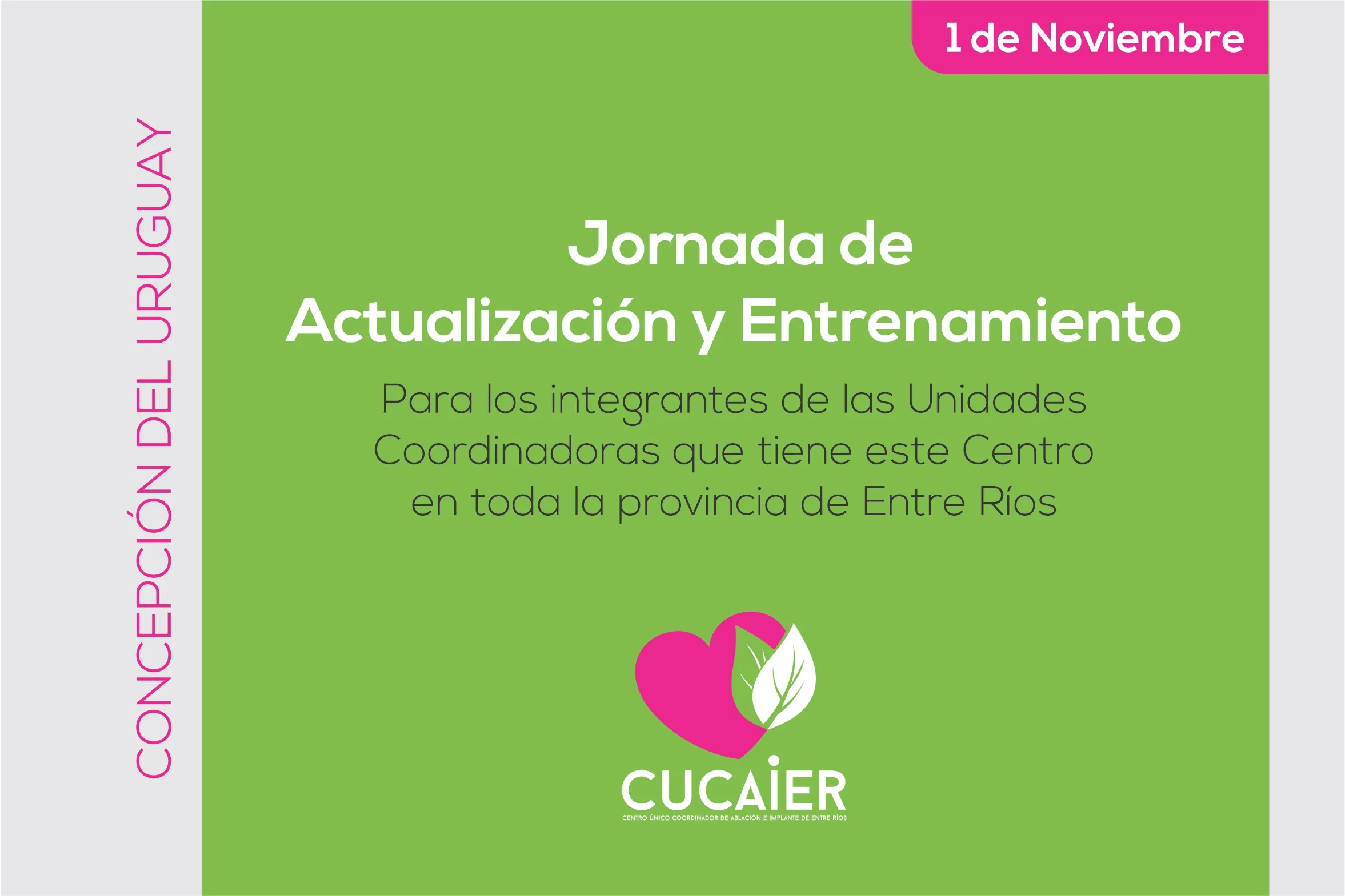 El Centro Único de Ablación e Implante de Entre Ríos (Cucaier) llevará adelante el próximo 1 de Noviembre una Jornada de actualización y entrenamiento para los integrantes de las Unidades Coordinadoras que tiene este Centro en toda la provincia de Entre Ríos. La actividad se llevará a cabo en la ciudad de Concepción del Uruguay y contará con la presencia de capacitadores del Instituto Nacional Central Único Coordinador de Ablación e Implante (Incucai).