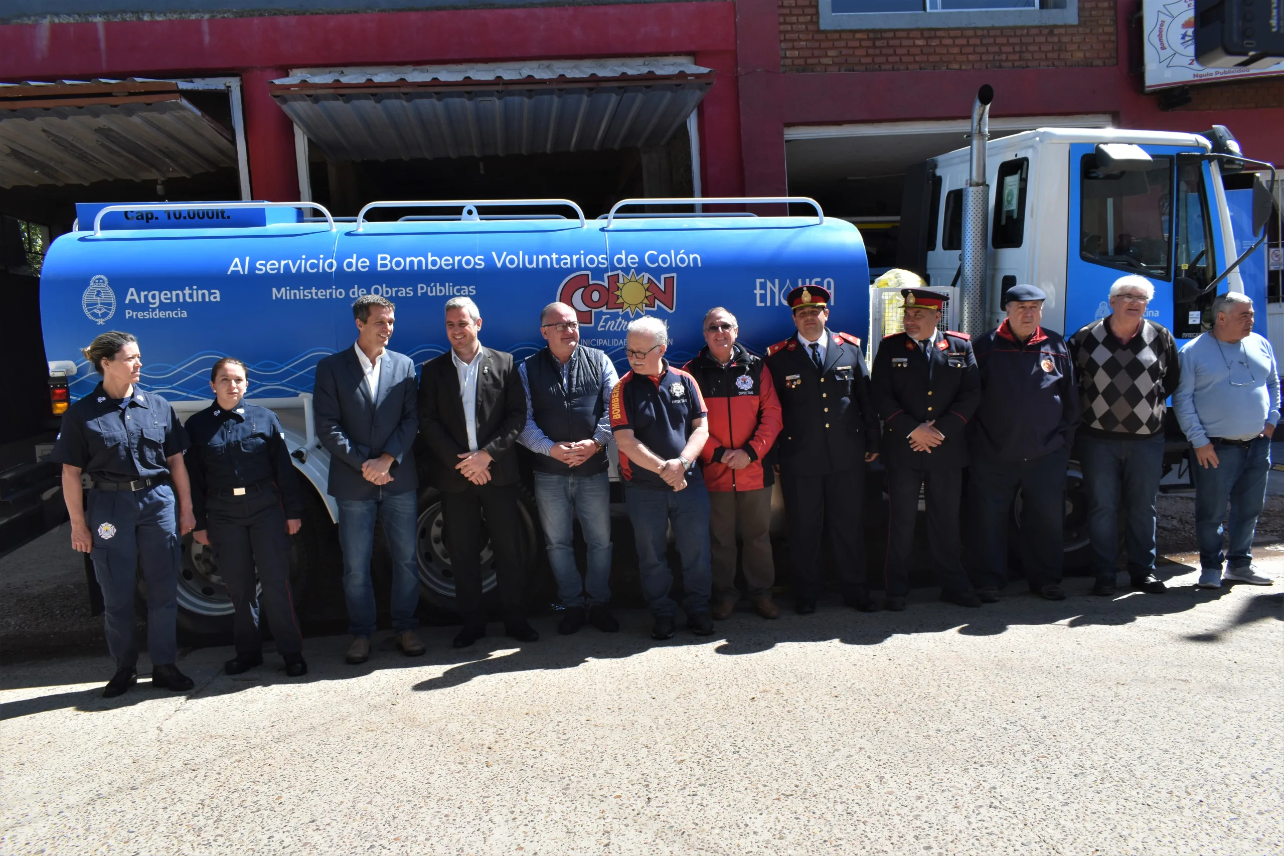 La Municipalidad de Colón recibió este lunes un camión cisterna para el transporte de agua potable que fue entregado a los Bomberos Voluntarios. Fue gestionado en conjunto por el Intendente José Luis Walser y el senador Mauricio Santa Cruz ante Enrique Cresto, titular del ENOHSA (Ente Nacional de Obras Hídricas de Saneamiento).