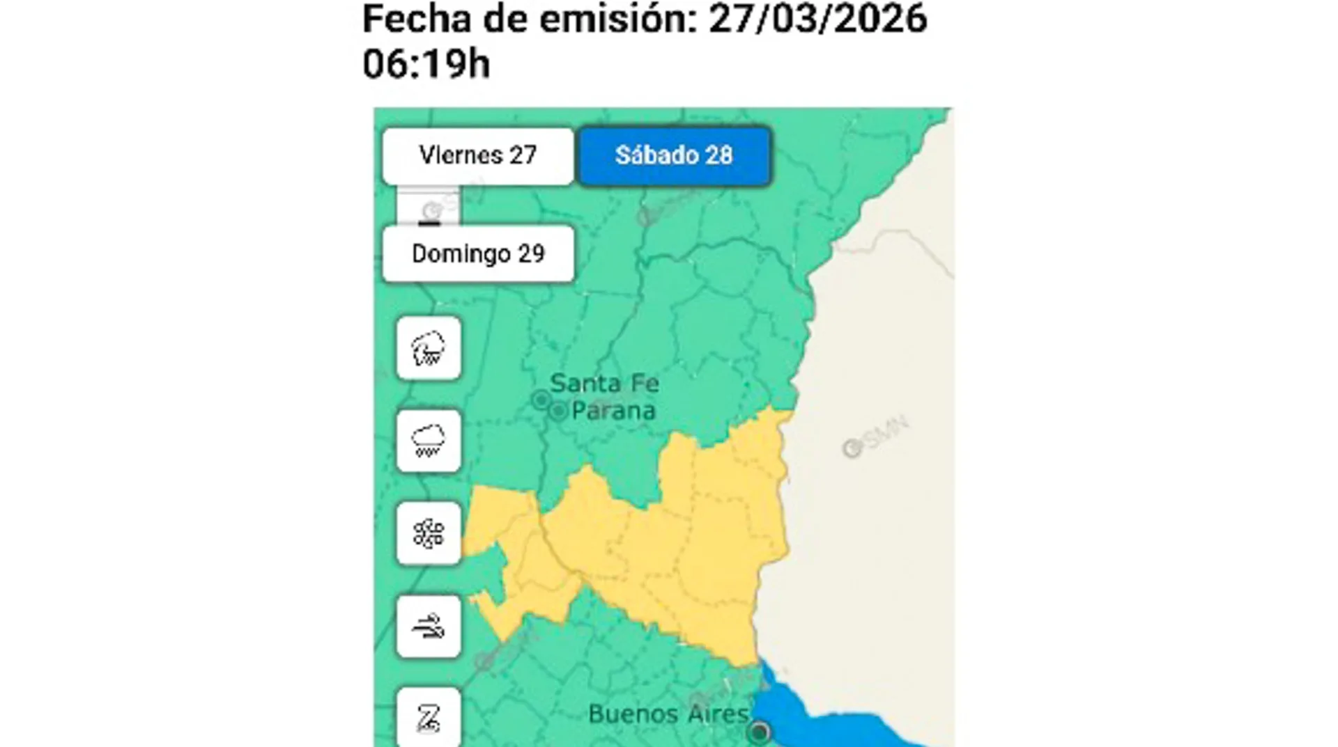 El área que abarca los departamentos Colón, Gualeguaychú, Islas del Ibicuy, Tala, Uruguay, Gualeguay y Victoria será afectada por lluvias y tormentas de variada intensidad, algunas localmente fuertes. Se espera que el fenómeno incluya precipitaciones, con abundantes caídas de agua en cortos períodos; vientos que podrían alcanzar los 80 km/h; fuerte actividad eléctrica y posibilidad de granizos.