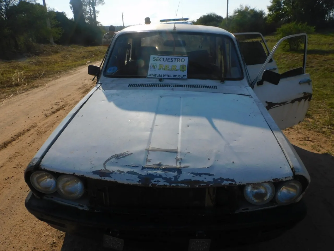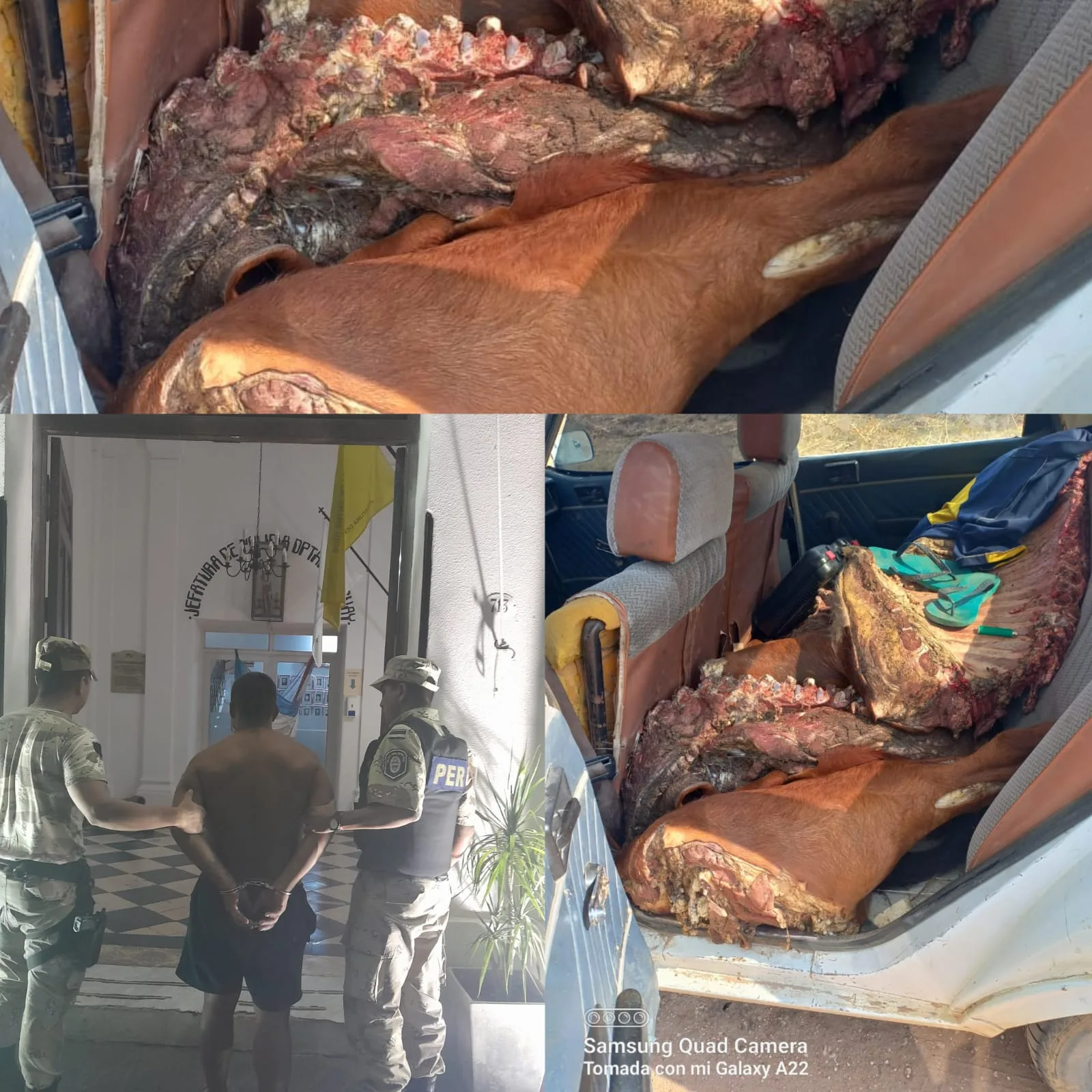 A raíz de hechos de abigeato en la zona del tigrero se intensificó en la zona, a lo cual en la fecha en horas de la tarde se detuvo 01 vehículo Renault 12, en el cual iban 3 ocupantes mayores de edad, que al presenciar el personal de brigada que se encontraba de operativo se intenta dar a la fuga, interceptado metros más adelante, en lo cual los 2 acompañantes se dan a la fuga en monte Tupido, interceptado al chófer, de unos 26 años de edad, se constató que el habitáculo trasero traían 02 terneros 250kg y 200 kg aprox. Sin cabeza y partido en medias reses, sin marca visibles. 01 aire comprimido reformado con vaina de calibre 22 en tubo cañón, cuchillos varios de gran tamaño todos con restos biológicos, como así también prendas con restos biológicos.