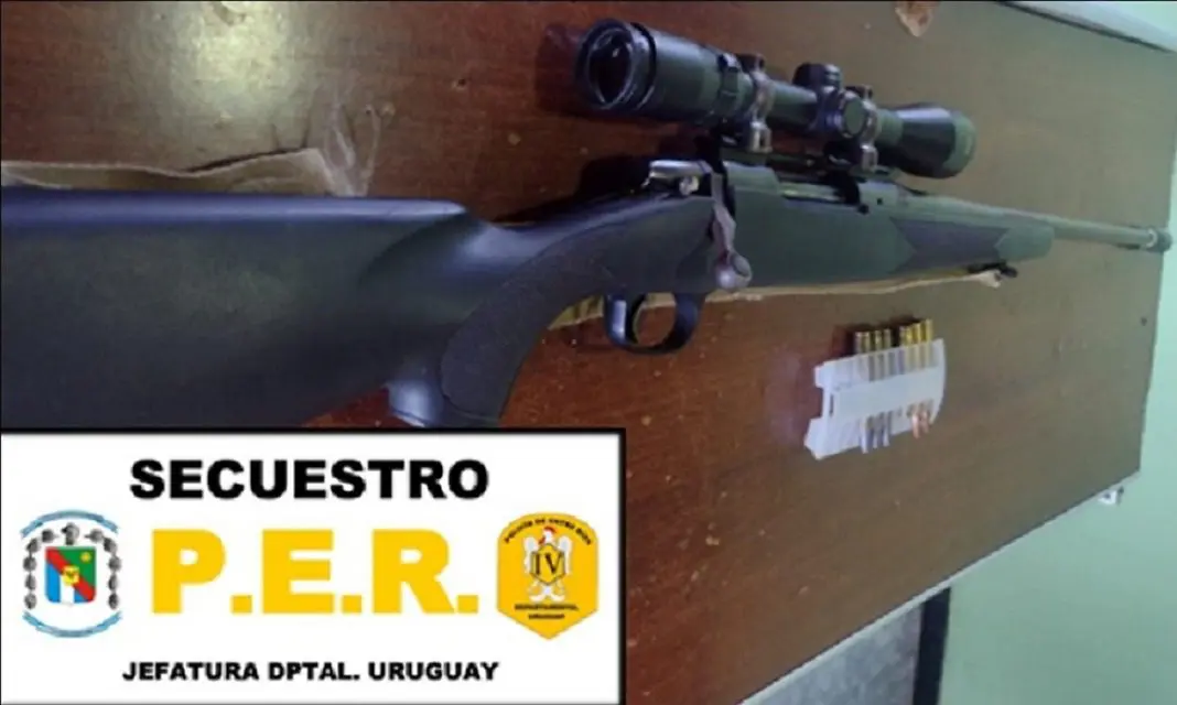 Además efectivos policiales observar dentro del vehículo un arma de fuego, tratándose de un fusil marca Springfield 30-06m, calibre 7,62, con cinco cartuchos de dicho calibre, solicitándole al propietario la documentación del arma, constatando que poesía el carnet de tenencia de arma de fuego vencido, por lo que con conocimiento de la fiscalía en turno se procedió al secuestro del arma con su cartuchería y mira telescópica, trasladando del ciudadano a sede de Jefatura departamental Uruguay, donde luego de ser identificado y examinado por el medico policial en turno se lo desocupo de todo tramite policial.