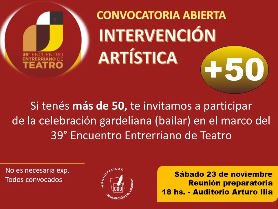 A partir del 29 de noviembre y hasta el 1 de diciembre, Concepción del Uruguay recibirá la 39° edición del Encuentro Entrerriano de Teatro. En este sentido, invitan a mayores de 50 años a ser parte de la Celebración Gardeliana y su reunión preparatoria y la participación final.