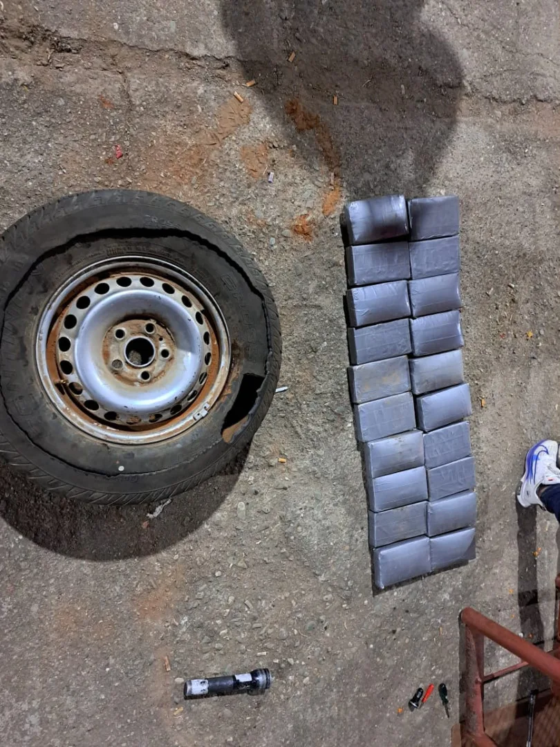 Al calibrar la rueda de auxilio del rodado con un barómetro, detectaron que éste no marcaba la calibración normal y al ser desinflada se logró visualizar 20 paquetes rectangulares.