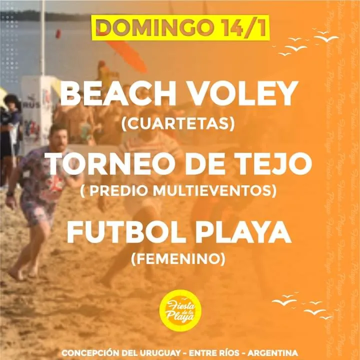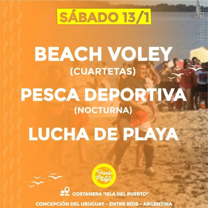 -“Torneo de Beach Voley de Cuartetas” 13 y 14/01 a las 15,00 hs -“Torneo de Pesca Deportiva Nocturna” 13/01 a las 20,00 hs hasta las 00,30 hs