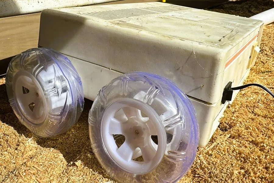 El robot es construido por estudiantes del ciclo básico de tercer año en el taller de computación, con la utilización de Arduino, una plataforma de creación de electrónica de código abierto y materiales reciclados en desuso, como por ejemplo la carcasa donde se encuentra montado. Las ruedas fueron diseñadas para optimizar la tracción en las camas de los galpones de pollos e impresas en las impresoras 3D por los estudiantes.