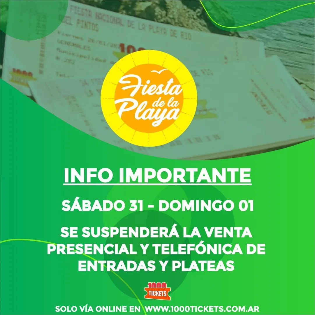 Durante los días 31 de diciembre y 1 de enero se suspende la venta de entradas y plateas en los puntos presenciales ubicados en Concepción del Uruguay, al igual que de manera telefónica. El único medio de compra activo será el sitio web de www.1000tickets.com.ar Allí se podrán adquirir entradas para las 5 noches de shows al igual que las plateas que aún quedan disponibles.