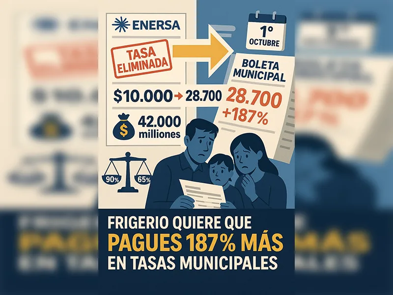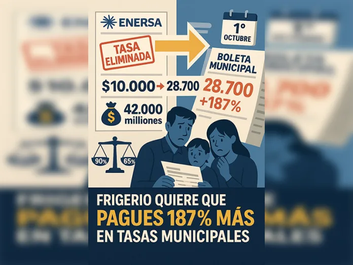 La propuesta es un engaño contable: eliminar la tasa de la boleta de ENERSA para esconderla en la Tasa General Inmobiliaria. El costo no desaparece: se traslada y se multiplica. Las cuentas son alarmantes: este movimiento generaría aumentos del 121% en lo liquidado. Pero hay una realidad aún más dura: como los municipios recaudan apenas el 65% de lo liquidado, el aumento efectivo para los vecinos cumplidores alcanzaría un 187%. Es decir, una familia que hoy paga $10.000 pasaría a abonar $28.700 mensuales.