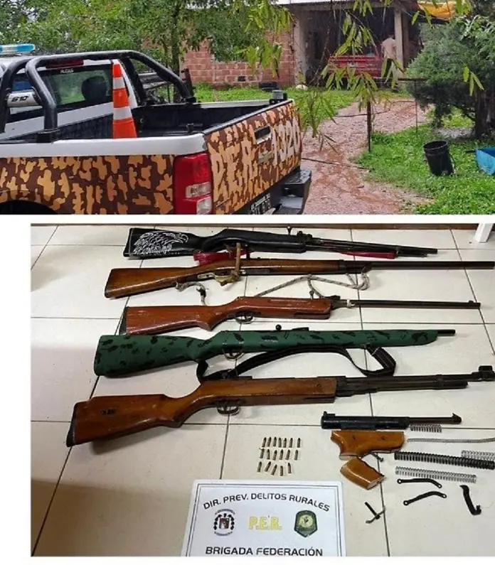 Como resultado del allanamiento se secuestraron una escopeta sin marca visible, Mod 71 con cerrojo, un aire comprimido Calibre 5,5 marca Lee, un aire comprimido reformado a Calibre 22, sin marca y numeral visible color negro, un aire comprimido reformado a Calibre 22, sin marca y numeral visible color verde con detalles en negro símil camuflado, un aire comprimido reformado a Calibre 22, marca “Sources Gun” sin numeral visible, una pistola de aire desarmada con numeración, con culata de madera resortes, guardamonte, abrazaderas y tornillo y cartuchos sin percutar Calibre 22.