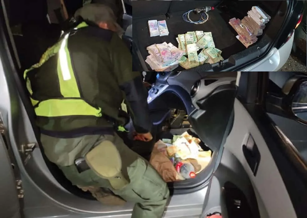 Al momento del control físico y documentológico, los funcionarios constataron la existencia de fajos de billetes argentinos acondicionados en el sector de la rueda de auxilio, en los paneles laterales del baúl y dentro del habitáculo, sin documentación que avale su tenencia legal.