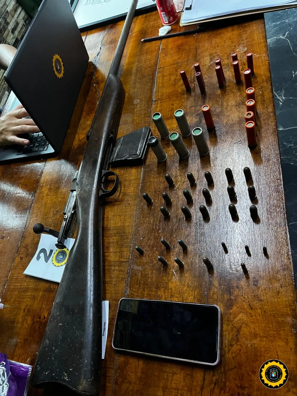 Un arma de fuego, cartuchería y elementos de fraccionamiento.