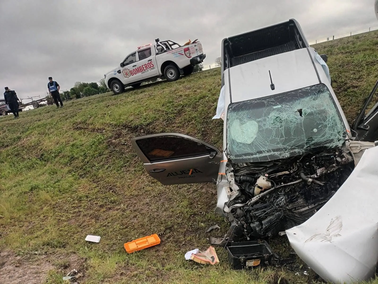 Por causas que se tratan de establecer, una camioneta Toyota Hilux color gris, perteneciente a la empresa Aluexa Aberturas, que circulaba en sentido Norte-Sur —desde General Ramírez hacia Buenos Aires— perdió el control y despistó hacia la banquina oeste, quedando incrustada al borde de una alcantarilla.
