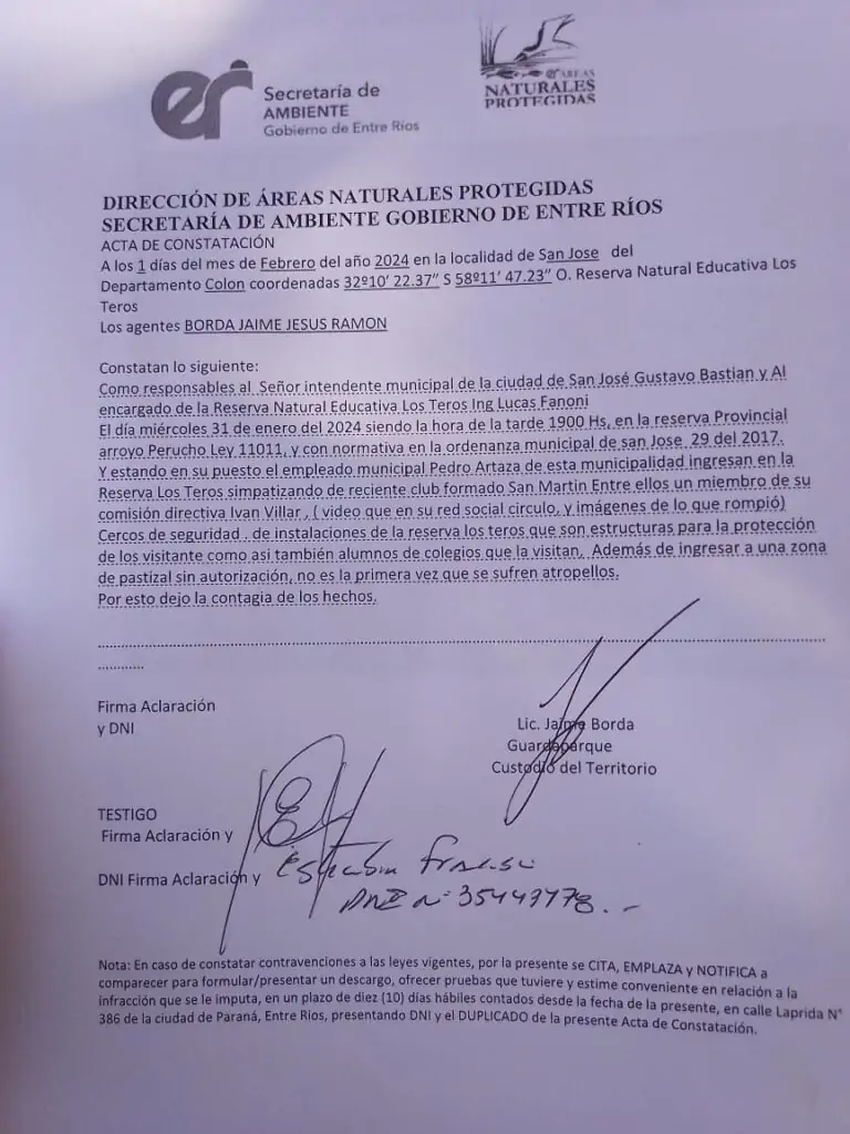 “Hasta el señor Villar sube a sus redes sociales el momento de cuando ingresan, incluso citando el tema “llegamos los pibechorros, al que se haga el vivo, plomo le vamos a dar”, ese tema. Así que bueno, yo el día de ayer, hice el acta para la provincia, donde responsabilizo al intendente y al señor Fanoni, del ingreso de estos simpatizantes y de la comisión directiva del club, denunciando áreas protegidas provincial con testigos, y también de las roturas que hicieron. Y voy a Fiscalía de Colón y hago la denuncia en la departamental. A este señor, que es el simpatizante del club, que se filma, y sube las fotos y postea todo esto, si vos no tenés la bendición de este padrino, no podría estar pasando esto. Porque ¿quién es el responsable en nuestro municipio de que la ley se cumpla? El intendente”, sentenció Borda.