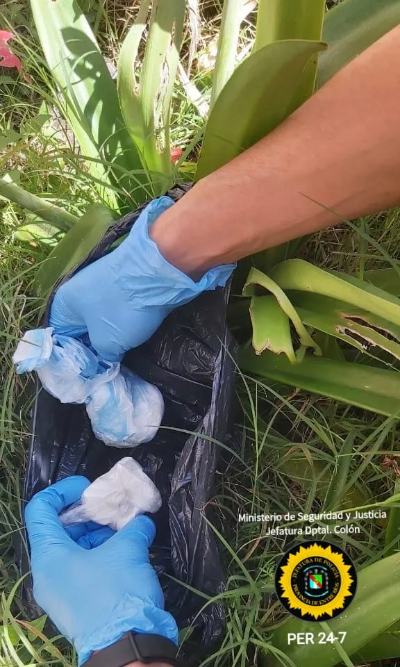 Al arribar al lugar, personal de la Jefatura Departamental Colón constató la presencia de un arma de fuego tipo pistola, marca Browning FN, calibre 7,65 mm, oculta al pie de un tapial del predio. Junto a la misma, se encontraba una bolsa de nylon negra, cerrada, que contenía una sustancia blanquecina.