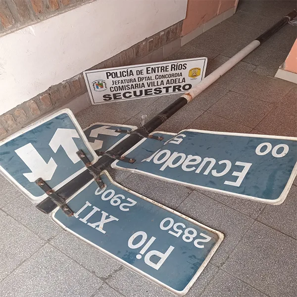 HURTO EN FLAGRANCIA: A raíz de un llamado telefónico los Efectivos de Comisaría de Villa Adela se constituyeron en las inmediaciones de calle Pte. Perón y Av. Frondizi, debido a que dos masculinos llevaban a cuestas un cartel indicador de calle, es por ello que al llegar rápidamente se los APREHENDE siendo ellos de 23 y 25 años. Luego, se comunica lo sucedido a la Fiscalía en turno que dispone su traslado a la Jefatura de Policía para proceder a identificarlos a posterior de recuperar su libertad, quedando supeditados en la causa por el S/DELITO DE HURTO EN FLAGRANCIA. –