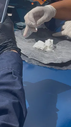 La rápida acción de los efectivos permitió interceptarlo a pocos metros. En el interior de la media, se halló una sustancia porosa de color blanca. Personal de la División de Drogas Peligrosas intervino en el lugar y confirmó que se trataba de una piedra compacta de cocaína con un peso de 56 gramos.
