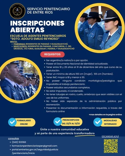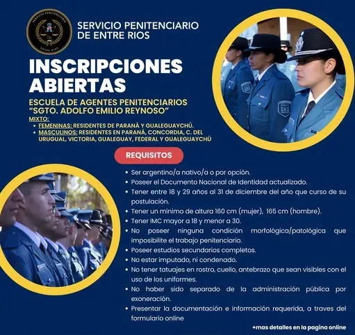 La Escuela de Agentes Penitenciarios “Sgto. Adolfo Emilio Reynoso” de la Provincia de Entre Ríos abre las inscripciones para la convocatoria 2025, invitando a todos los interesados en formar parte del Servicio Penitenciario de Entre Ríos a inscribirse de manera online. La formación, orientada a la capacitación como Agente Penitenciario – Nivel III, tendrá una duración de seis meses bajo la modalidad internado, en el Campus Educativo de Villaguay.