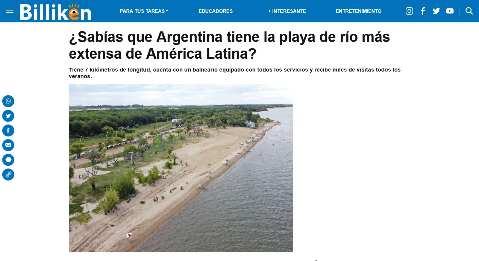 Pero en esta ocasión, es la naturaleza propia de nuestra ciudad lo que ha llamado la atención de Billiken, la famosa revista latinoamericana. En una nota titulada “¿Sabías que Argentina tiene la playa de río más extensa de América Latina?”, el medio hace referencia al imponente Banco Pelay, que posee 7 kilómetros de extensión sobre el río Uruguay.