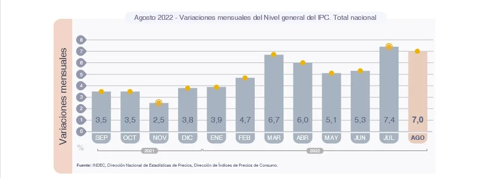 La inflación sigue caliente en Argentina y trepó hasta el 7%, aunque desaceleró respecto de julio, cuando tocó el nivel más alto en 20 años (7,4%). En tanto, en los últimos 12 meses acumuló un incremento del 78,5%, el más elevado en tres décadas, según informó este miércoles el Instituto Nacional de Estadística y Censos (INDEC). Además, en los primeros ocho meses del año la inflación acumulada llegó al 56,4%