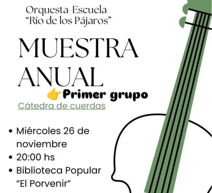 La Orquesta Escuela “Río de los Pájaros” realizará su Muestra Anual este miércoles 26 de noviembre a las 20:00, en la Biblioteca Popular “El Porvenir”, ubicada en San Martín 782, en la ciudad de Concepción del Uruguay, Entre Ríos.
