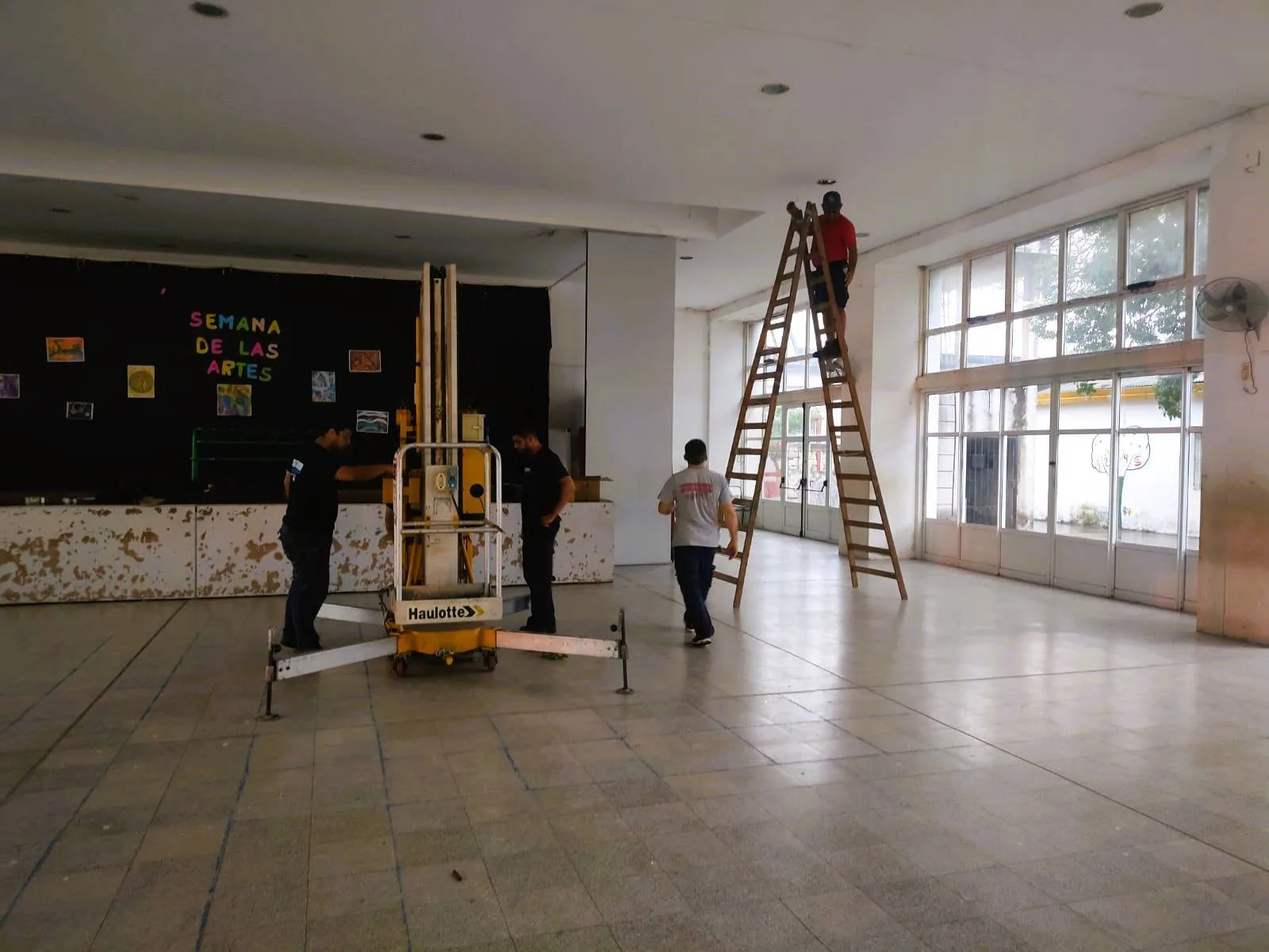 Desde hace tiempo, que el salón de actos - compartido con la Escuela Avellaneda - carece de iluminación. Uno de los inconvenientes es la altura del techo para cambiar las lámparas, motivo por el que un grupo de electricistas se unieron para proceder con la tarea y brindar solución al establecimiento.