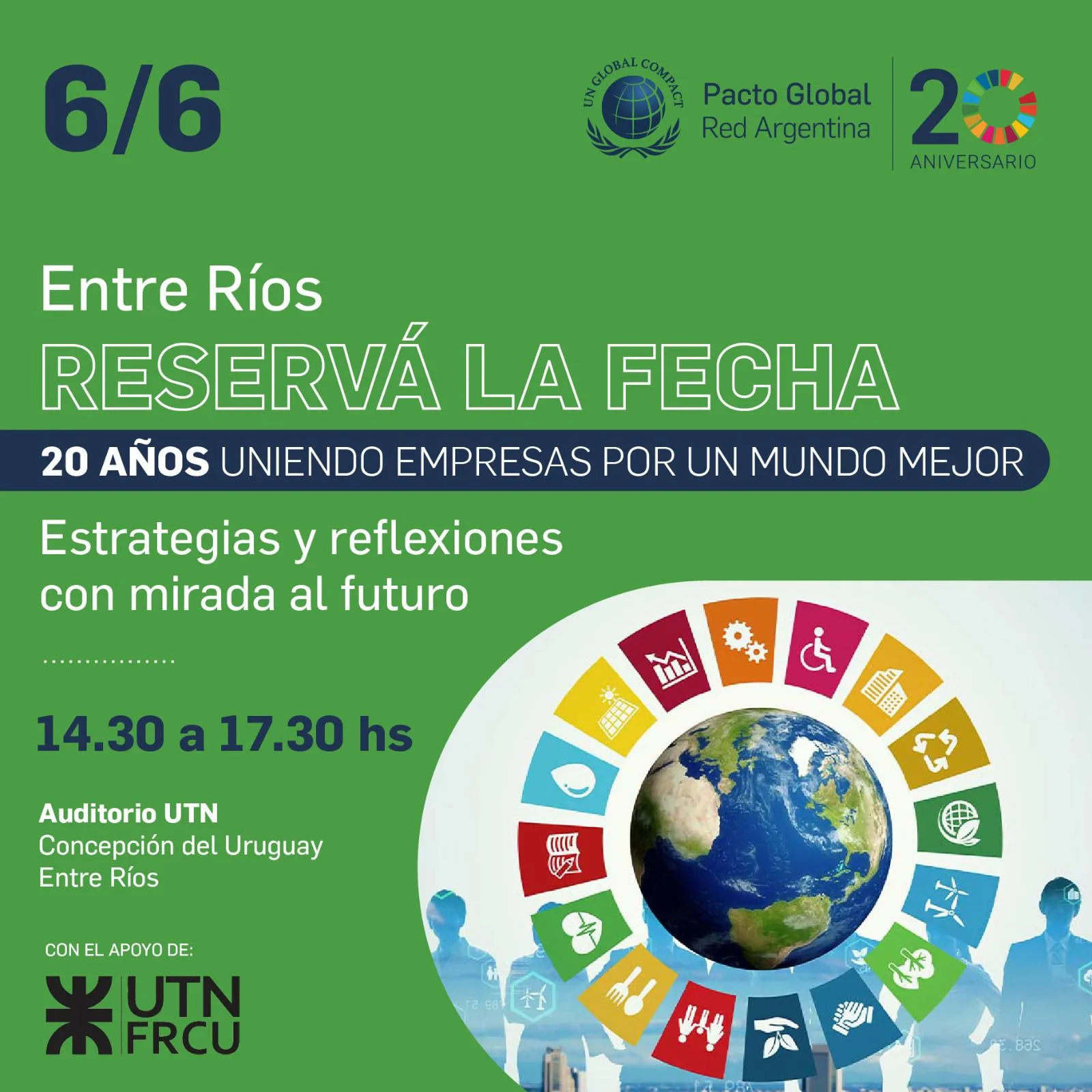 Bajo el lema «𝟮𝟬 𝗮𝗻̃𝗼𝘀 𝘂𝗻𝗶𝗲𝗻𝗱𝗼 𝗲𝗺𝗽𝗿𝗲𝘀𝗮𝘀 𝗽𝗼𝗿 𝘂𝗻 𝗺𝘂𝗻𝗱𝗼 𝗺𝗲𝗷𝗼𝗿. 𝑬𝒔𝒕𝒓𝒂𝒕𝒆𝒈𝒊𝒂𝒔 𝒚 𝒓𝒆𝒇𝒍𝒆𝒙𝒊𝒐𝒏𝒆𝒔 𝒄𝒐𝒏 𝒎𝒊𝒓𝒂𝒅𝒂 𝒂𝒍 𝒇𝒖𝒕𝒖𝒓𝒐» se invita a empresas, estudiantes, docentes, vecinos y público en general a sumarse a un gran evento. Las empresas entrerrianas firmantes del pacto global realizarán una presentación de las principales acciones que vienen realizando en el marco de la Responsabilidad Social y los Objetivos de Desarrollo Sostenible.