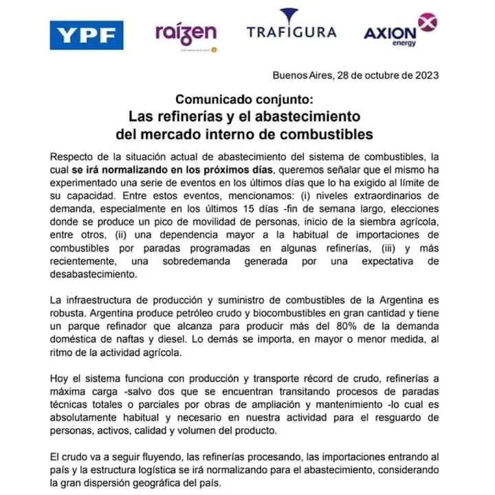 A través de un comunicado, las compañías YPF, Axion, Raízen y Trafigura salieron a aclarar que la situación «se irá normalizando en los próximos días», y explicaron, en línea con lo que ya dijo el Gobierno, que la provisión de naftas sufrió una «serie de eventos en los últimos días que lo ha exigido al límite de su capacidad».