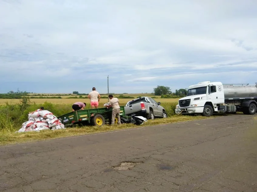 En la mañana de este sábado alrededor de las 10hs, personal policial de Comisaria Libaros toma conocimiento de un siniestro vial en ruta Provincial 20, en el Km 101, una vez los uniformados en el lugar, constatan lo ocurrido, tratándose de un despiste y posterior vuelco de un tráiler, que transportaba agroquímicos, siendo remolcada por una camioneta Volkswagen Amarok, conducida por un hombre mayor de edad de zona rural de la ciudad de Gualeguaychú.