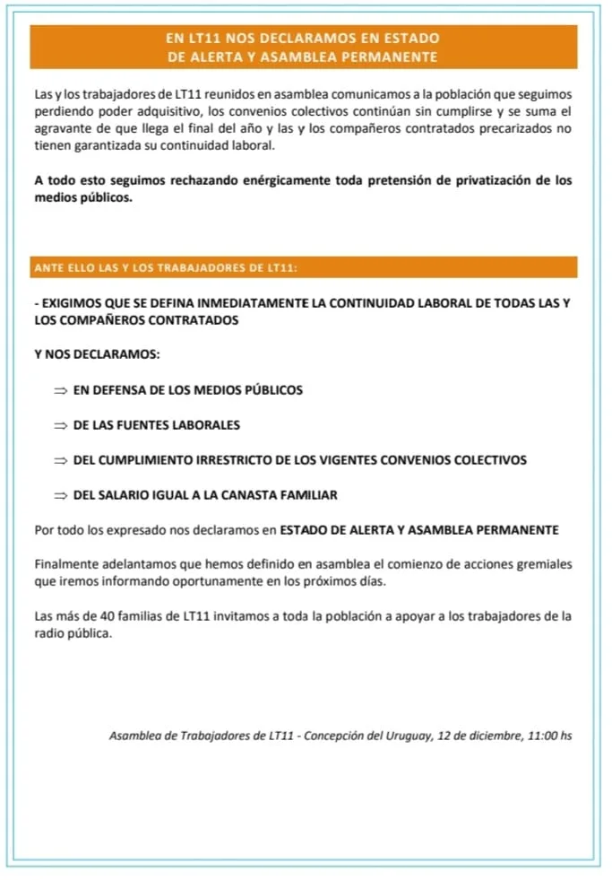 Asamblea de Trabajadores de LT11 – Concepción del Uruguay, 12 de diciembre de 2023, 11 hs.