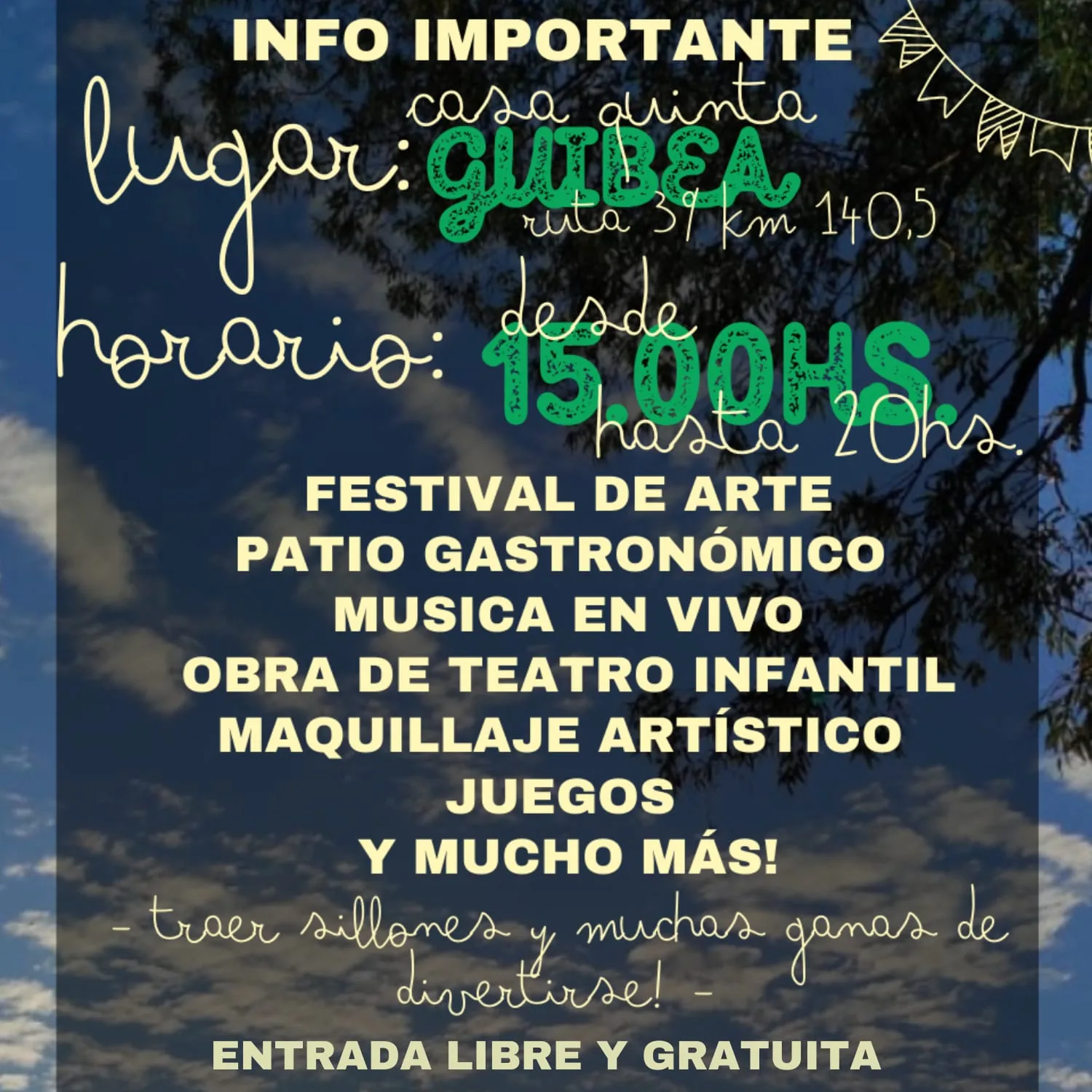 La cita será en Casa Quinta «GUIBEA», ubicada en Ruta 39 Km 140,5, desde las 15 hasta las 20 horas. La entrada es libre y gratuita, por lo que se invita a toda la comunidad a disfrutar de este festival artístico que promete ser una jornada inolvidable.