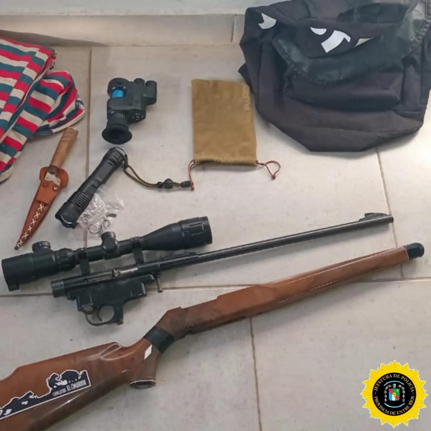 Por último, en la noche del lunes 29, la Brigada de Tala y Maciá realizó un allanamiento en una vivienda de calle Saenz Peña, en Rosario del Tala, donde se incautó otra carabina calibre .22 junto con elementos de interés. La medida se realizó en el marco de una causa por abigeato (carneada), denunciado por un productor rural de la zona de Ruta 15.