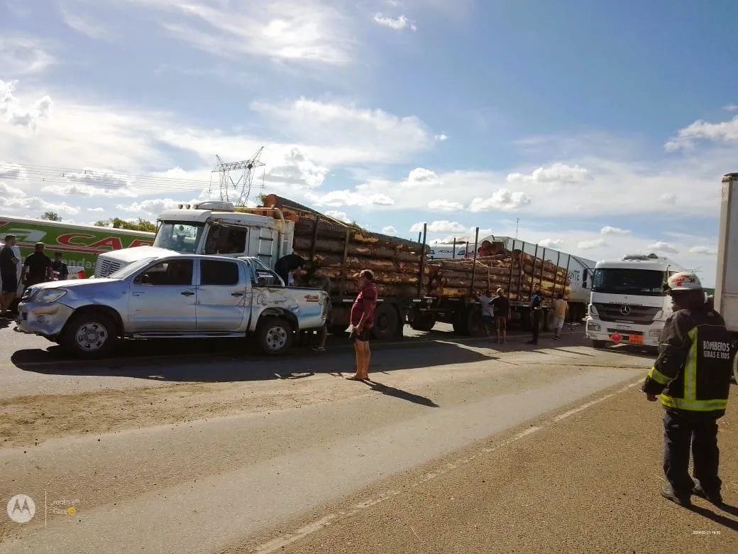 Camión de marca Scania, modelo R450, con semirremolque de marca Ibiporá, perteneciente a la empresa Brilhante transportes, conducido por masculino de 45 años de edad, domiciliado en República de Brasil, el mismo posee daños en su posterolateral izquierdo. Segundo vehículo de gran porte camión de marca Mercedes Benz, modelo 1935, con acoplado cargado con palos, conducido por masculino de 29 años de edad, domiciliado de Ubajay, En la parte frontal del camión se observa la colisión con una camioneta de marca Toyota, modelo Hilux, con daños de consideración, conducida por masculino de 61 años de edad, domiciliado en Ceibas, acompañado por femenina, tercer vehículo de gran porte camión de marca Mercedes Benz, modelo Axor 1933, con cisterna tanque, con daños en su lado izquierdo, conducido por masculino de 29 años de edad, domiciliado en Provincia de Buenos Aires. Cuarto Vehículo de gran porte camión de marca Iveco, modelo 170E28T, con semirremolque de marca Pincén, de transporte de productos alimenticios, conducido por masculino de 45 años de edad, domiciliado en Merlo, Provincia de Buenos Aires, daños mínimos en la parte posterior del semirremolque. Por último, se observa un automóvil de marca Volkswagen, modelo Voyage, con daños en su parte trasera, conducido por masculino de 51 años de edad, domiciliado en Provincia de Buenos Aires, acompañado de una mujer de 48 años y una menor de 12 años y masculino 17 años de edad. Afortunadamente no se registró ninguna persona lesionada.
