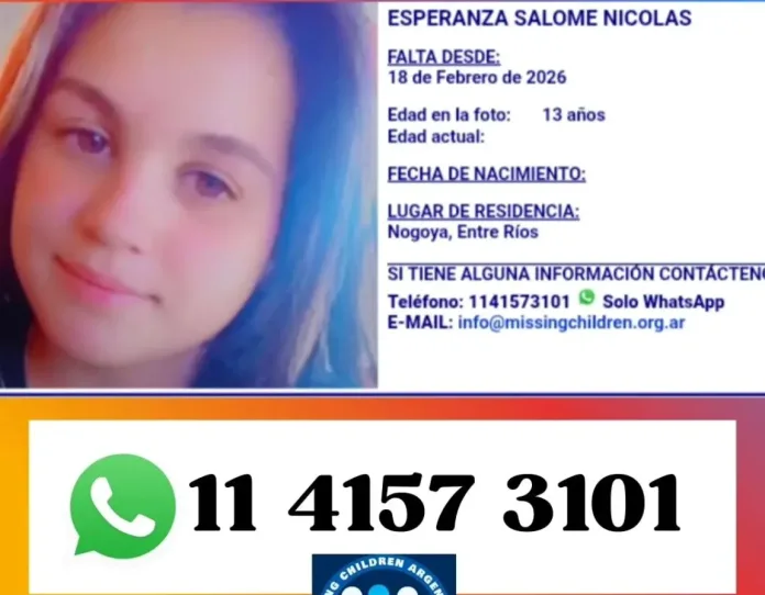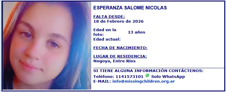 La organización Missing Children Argentina activó formalmente la búsqueda de una adolescente entrerriana de 13 años y difundió su imagen a nivel nacional con el objetivo de ampliar el alcance del pedido de localización.