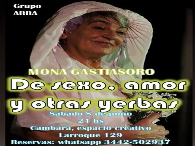 Este sábado 08 de junio, a partir de las 21:00 Hs, en el “Cambará Espacio Creativo” en Larroque 129, se presentará el monólogo humorístico “De sexo, amor y otras yerbas”, protagonizado, escrito y dirigido por Mona Gastiasoro, con el aporte en el diseño de luces y sonido de María E Pozo G y la colaboración de Daniel Martínez. –