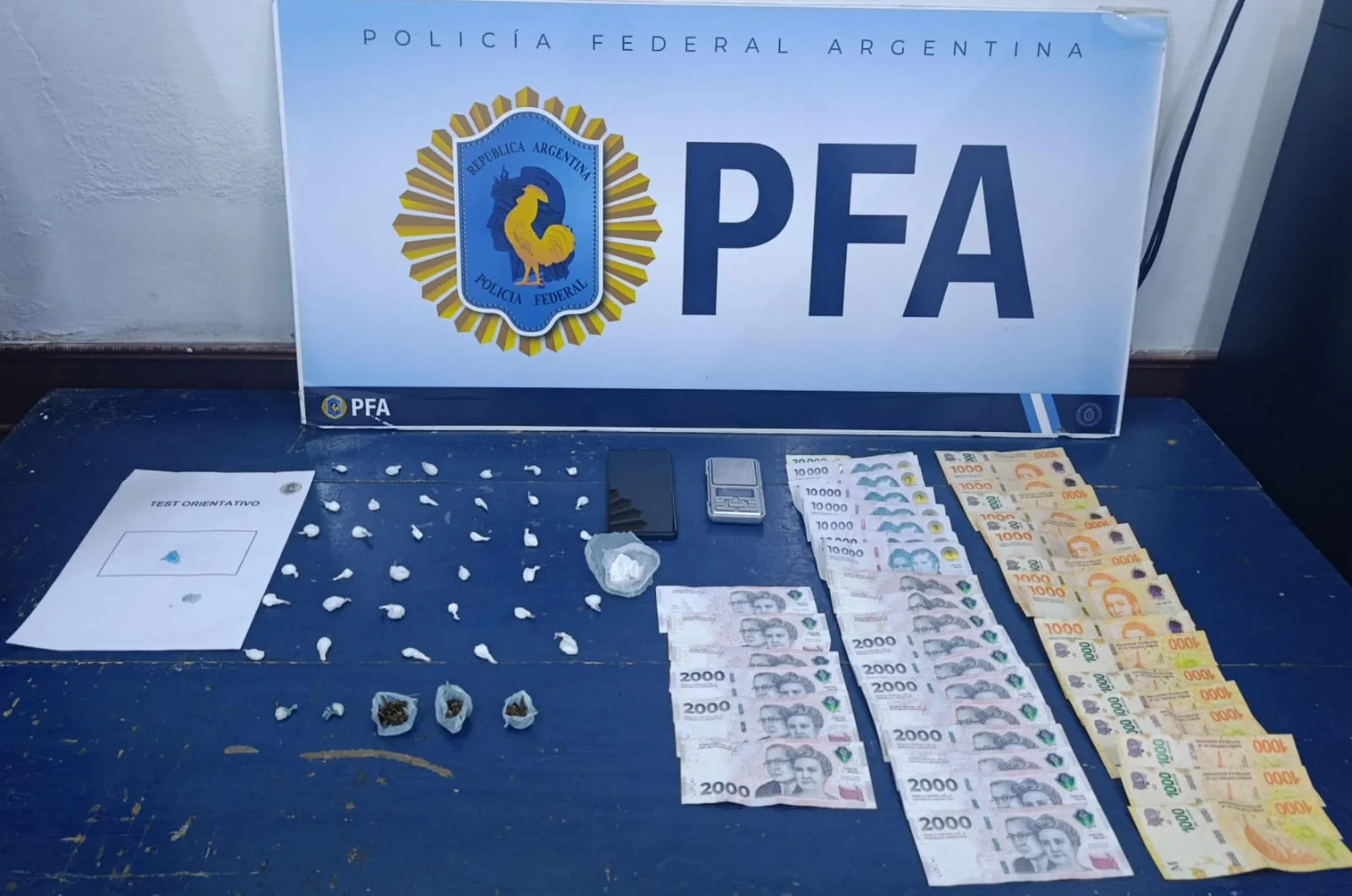 Durante el palpado preventivo y la inspección de sus pertenencias, los uniformados hallaron una cantidad significativa de dosis de cocaína fraccionadas y listas para su comercialización, envoltorios de marihuana, una balanza de precisión utilizada para el pesaje de sustancias y dinero en efectivo en billetes de distinta denominación.