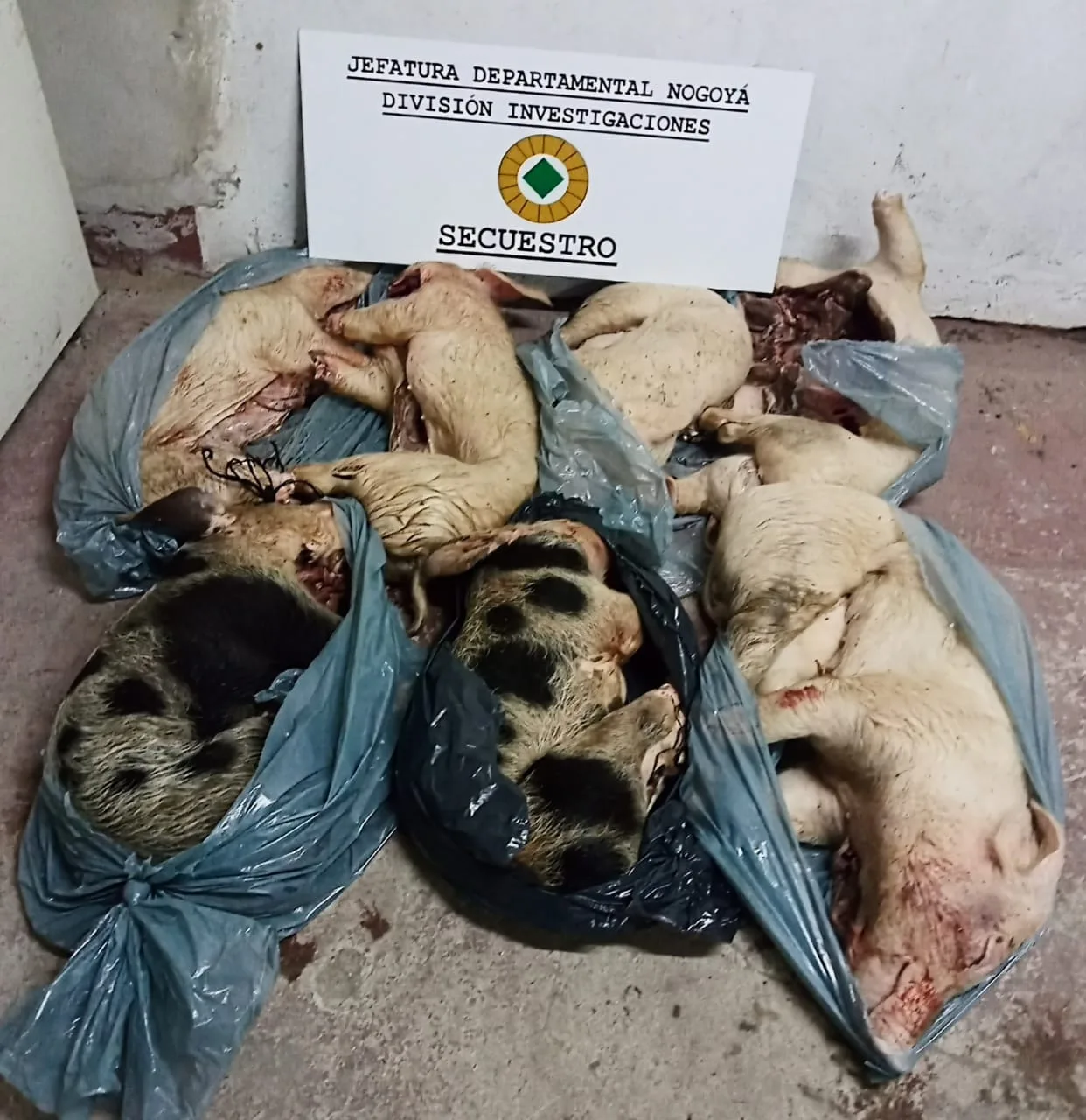 En el marco de actuaciones iniciadas en fecha 31/03/2023 de Oficio Policial por el supuesto delito de Abigeato, personal de la División Investigaciones Departamental Nogoyá, luego de realizar distintas tareas investigativas logró dar con los posibles autores del hecho, individualizando posteriormente a dos masculinos involucrados y obteniendo por ello dos medidas de allanamiento ordenadas por el Dr. Juan Pablo Orlandi, arrojando resultados positivos. De una de las fincas allanadas, ubicada en calle Moreno de nuestra ciudad, se procedió al secuestro de siete lechones faenados, con sus respectivos pelajes, y se localizó una pezuña de porcino, trasladando del lugar a un masculino para su correcta identificación. Mientras que en la finca ubicada en Bv. Alberdi se pudo secuestrar elementos varios, tales como cuchillas de carnicero, vestimenta con vestigios de sangre y en el fondo del inmueble se localizaron veintidós pezuñas de cerdo, de distintos pelajes, trasladando desde allí a cuatro masculinos para su identificación, y a un menor de edad para ser entregado a sus progenitores.