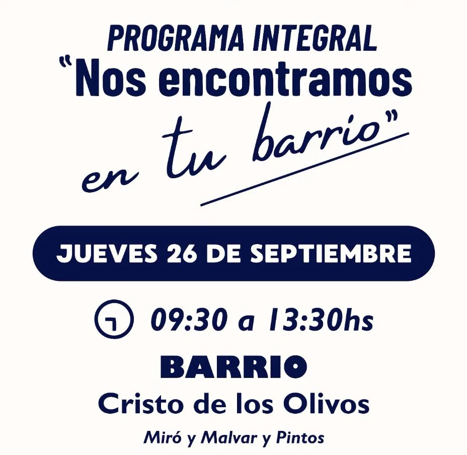 A través de las secretarías de Salud, Discapacidad y Derechos Humanos junto a la de Desarrollo Social y Educación, el Estado municipal desarrollará un nuevo abordaje del Programa Integral “Nos Encontramos en tu Barrio” este jueves, en Cristo de los Olivos, en la intersección de las calles Miró y Malvar y Pintos.