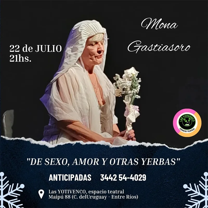 En el mismo espacio teatral el unipersonal se había presentado en el mes de Enero con una excelente respuesta del público, y luego de realizar funciones en nuestra ciudad en diferentes ciclos tales como ESI en los clubes en el Club Tomás de Rocamora, en el debate teatral organizado por la Asociación de la Magistratura de la Provincia y la Municipalidad de C. del Uruguay, en el ISFD Mariano Moreno y en las ciudades de Basavilbaso, Santa Anita y Colón, vuelve en estas vacaciones de julio a Concepción del Uruguay, en este entrañable y cálido espacio teatral de Las Yotivenco.-