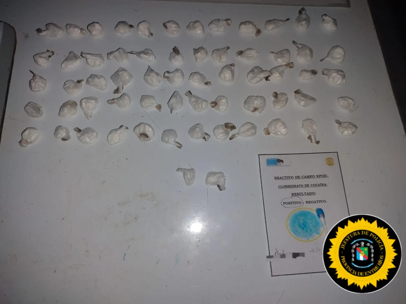 Tras resguardar el lugar, el Grupo Especial inició la requisa de los ocupantes del inmueble. Durante el procedimiento, se identificó a un masculino de 59 años que usaba una “boina” y que, al ser inspeccionado, se encontró en su poder una gran cantidad de envoltorios de nylon. Al realizarle un test de campo orientativo, se confirmó que contenían Clorhidrato de Cocaína.